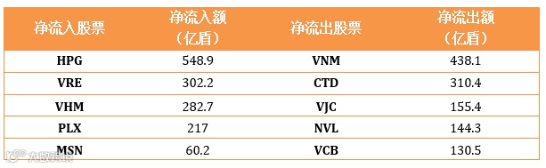 在胡志明证交所HOSE外资净流入74.8亿盾,河内证交所HNX外资净流入96.7亿盾。