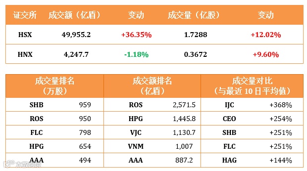 此外,同富橡胶DPR, 福和橡胶PHR, 西宁橡胶TRC等橡胶股以及南新鸳工业区NTC, VRG西贡投资SIP, 工业发展投资BCM, SONADEZI 州德SZC等工业园地产板块也大幅上涨。