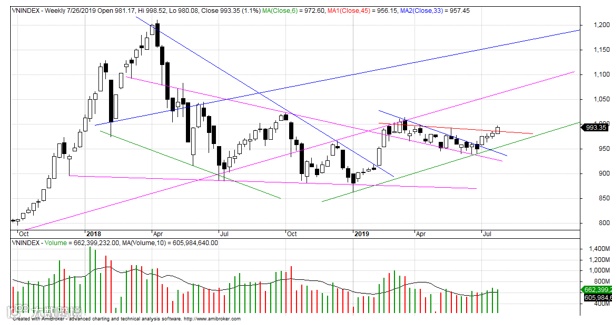 上周越南指数开盘在990点区受阻并交易放缓。然而,下一个交易日该指数积极上涨并盘中冲破此区。周三市场再次考验阻力线,周五正式征服990点里程碑。周五小幅下调。越南指数延续四周上涨并正式冲破了990点阻力区。下个目标将是前期中期高峰1015点,但是市场需要经过蓄力阶段后继续稳健上行。990点区不再是阻力区而将是市场的支撑。