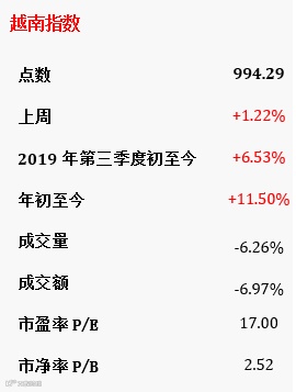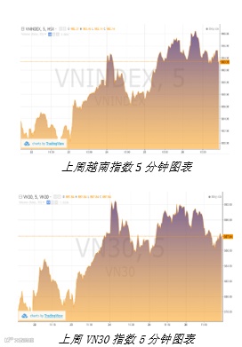 上周首个交易日越南指数在980-985点区盘整波动,收报微跌0.3点,跌幅0.03%。周二蓝筹股特别是Vinhomes地产VHM,Vin集团VIC和Vincom零售VRE积极上涨支撑了市场,该指数收盘上涨7.42点。周三早盘市场延续涨势后交易放缓并周攀小幅下调。周四Vin群组以及蓝筹股继续拉升越南指数收报994.95点。然而,石油,银行,房地产和建设板块拉跌指数小幅下调,收盘于993.35点。本周交易结束,越南指数较前一周上涨1.22%。