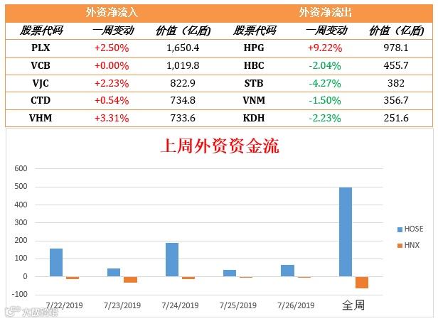 在胡志明证交所,外资延续三周净流入,总额4970亿盾。与此同时,在河内证交所外资净流出640亿盾。