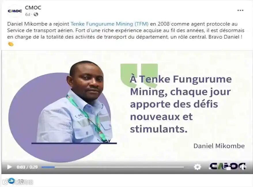 其中,介绍全球各业务单元优秀ESG实践的内容最受欢迎。CMOC脸书官号11月7日讲述TFM社区奖学金获得者Wilson故事的帖子,累计得到3千多次点赞和100多条热情的评论。