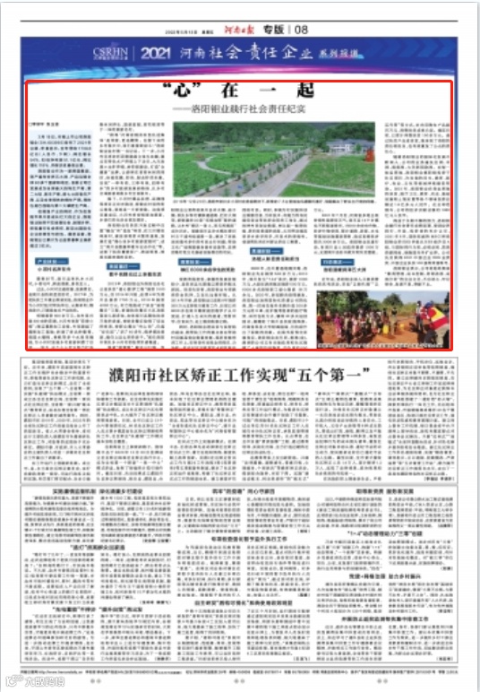 活动启动以来,为进一步讲好企业履行社会责任的故事,充分发挥对经济发展的引领和支撑作用,河南日报客户端特推出“河南社会责任企业”特别专题,遴选事迹突出的龙头企业进行报道。5月13日,该报以《“心”在一起——洛阳钼业践行社会责任纪实》为题,对洛阳钼业履行社会责任情况进行报道。