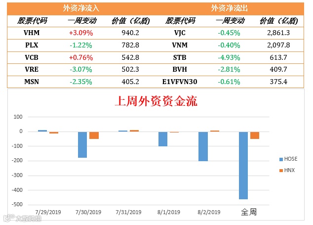 随着越南指数的走势,延续5周净流入之后,在胡志明证交所外资获利回吐,净流出额近5000亿盾,其中主力卖出越捷航空2823亿盾,特别是通过大宗交易方式净流出2350亿盾。其次为越南牛奶VNM净卖出1870亿盾。