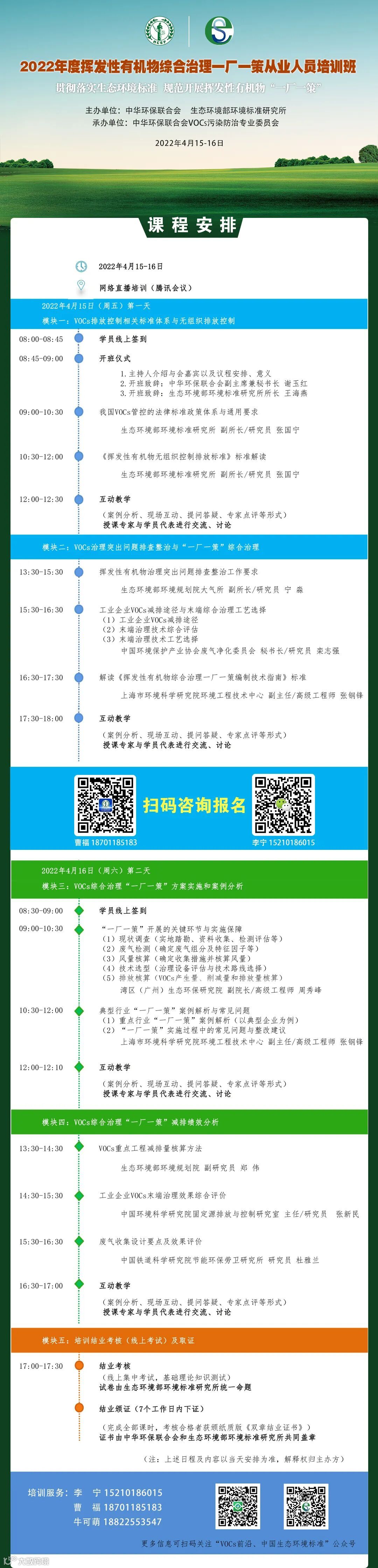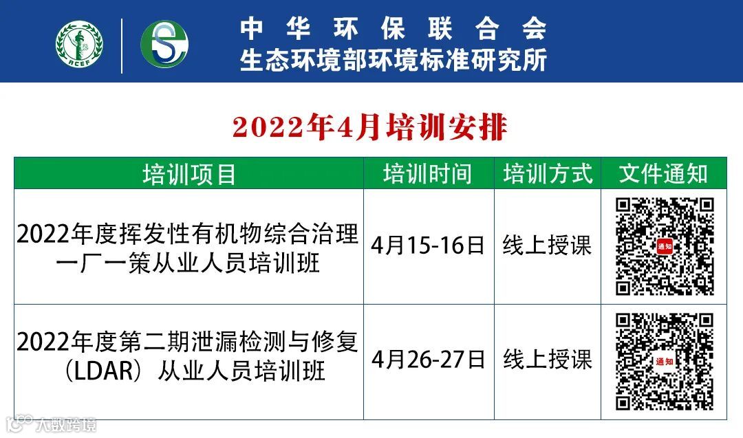 2022年4月15-16日面向全国举办“2022年度挥发性有机物综合治理一厂一策从业人员培训班”。