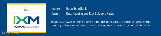 2021年4月,埃珂森IXM与恒生中国创新性地达成了内地首笔包含环境、社会及公司治理(ESG)条款的人民币利率衍生品交易,成为首家完成此类交易的公司。IXM与恒生中国达成的将ESG条款应用于人民币利率衍生品的交易,通过在条款设置上正向挂钩企业在ESG方面的表现,使得ESG指标达标的企业进一步降低融资成本,鼓励通过低碳、节能、环保的方式,实现可持续高质量发展。