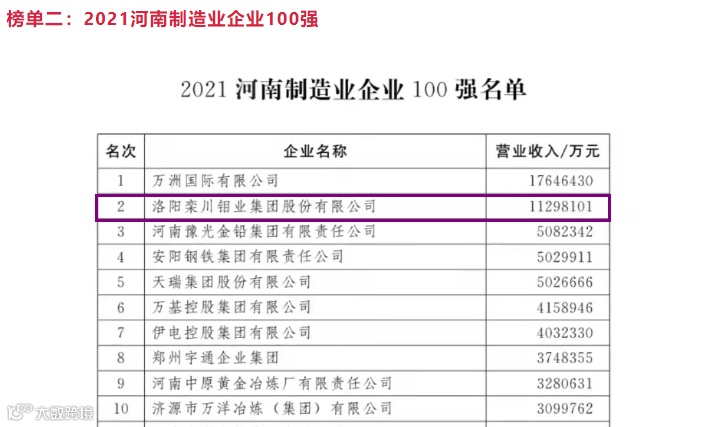 这是河南省企联连续第16次发布河南企业100强。此次的100强榜单,洛阳栾川钼业集团股份有限公司(以下简称洛阳钼业)以营收1129.81亿元排名第四。