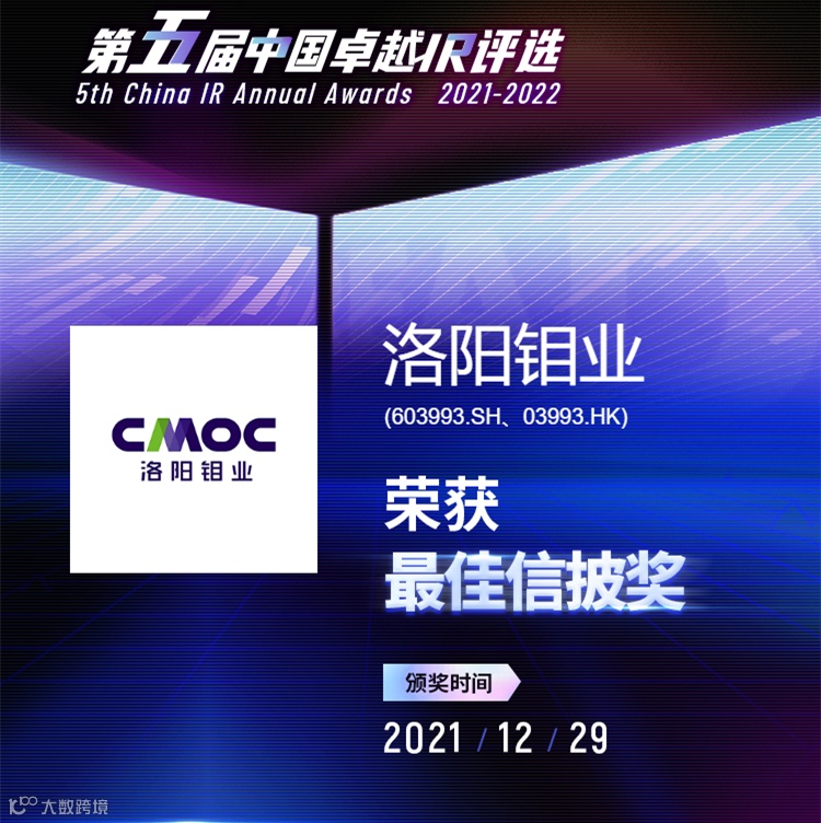 近日,由Roadshow China路演中及其旗下品牌卓越IR联合举办的2021-2022上市公司投资者关系创新峰会暨第五届卓越IR颁奖盛典成功举行。洛阳钼业因在信息披露、ESG方面的优秀表现,荣获“中国卓越IR最佳信披奖”和“中国卓越IR最佳ESG奖”。