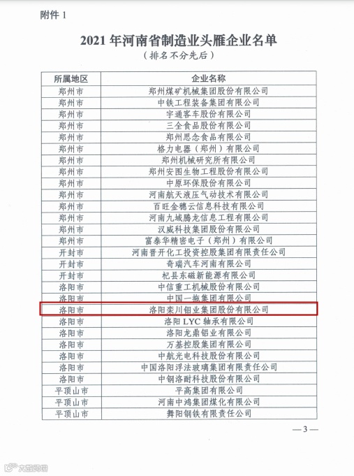 近日,从工信部门获悉,河南省制造强省建设领导小组办公室以“豫制造强省办【2021】16号”下发通知,公布了经认定的80家河南省制造业头雁企业,洛阳栾川钼业集团股份有限公司赫然在列。