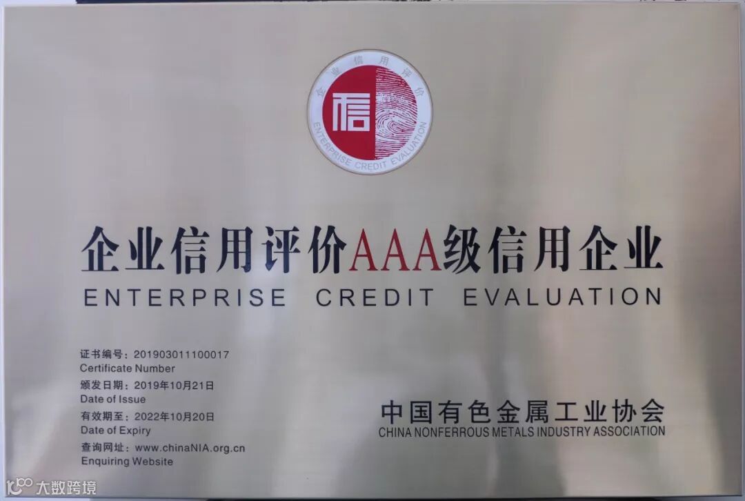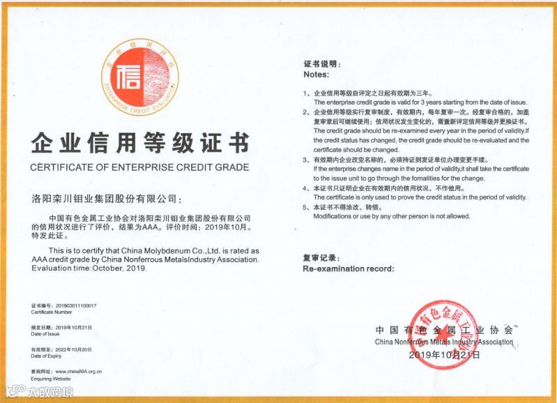 近日,经全国有色金属行业企业信用等级评价委员会评审、公示,并报国家工信部备案,洛钼集团等22家企业被中国有色金属工业协会评为2019年度“企业信用评价AAA级信用企业”,并授予证书和牌匾,这是目前中国有色金属企业信用评定的最高等级,也是洛钼集团首次荣获该项荣誉。