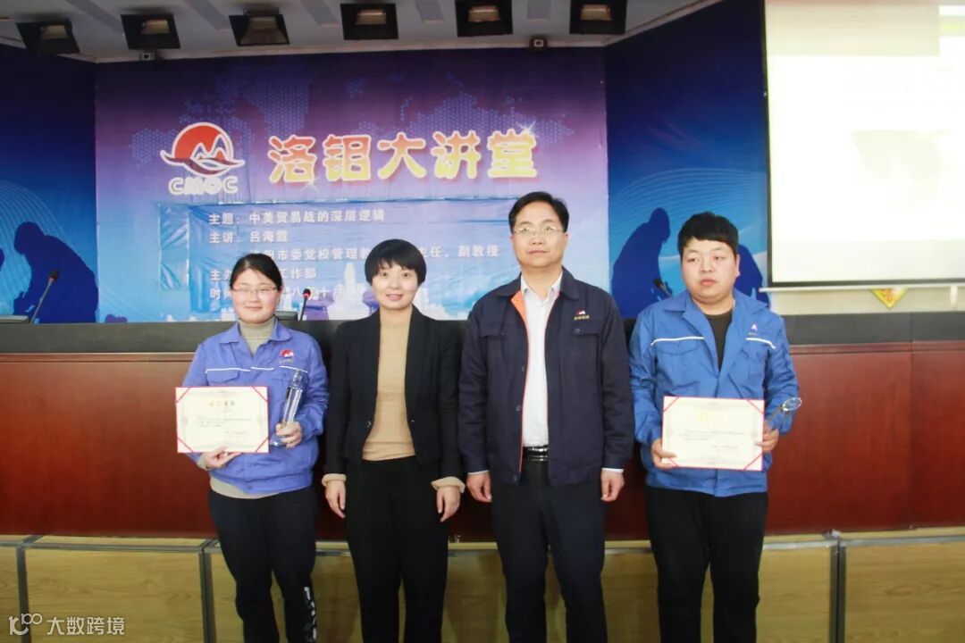 人力资源部部长王延文、洛阳环球雅思学校校长冯盼盼共同为培训过程中表现优秀的同学颁发证书。金属材料公司张庆恩、矿山公司闫伟峰、钨业公司王欣欣、金属材料公司田三坤分别荣获优秀学员奖,选矿三公司杜晴晴、矿山公司杜介荣获最佳口语奖,选矿三公司冯宏杰、研究院王洛锋荣获最佳进步奖,钨业一公司贺阁、公司机关申珅荣获优秀全勤奖。