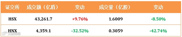 在胡志明证交所HOSE外资净流出1070.8亿盾,河内证交所HNX外资净流出598亿盾。