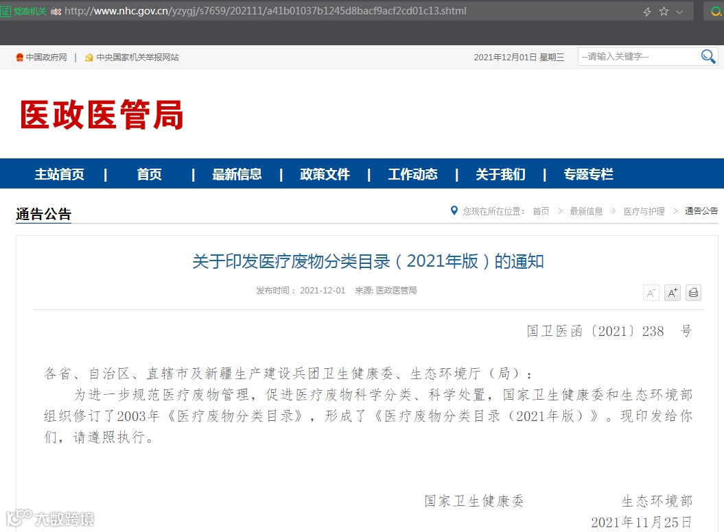为进一步规范医疗废物管理,促进医疗废物科学分类、科学处置,国家卫生健康委和生态环境部组织修订了2003年《医疗废物分类目录》,形成了《医疗废物分类目录(2021年版)》。现印发给你们,请遵照执行。