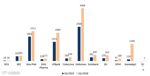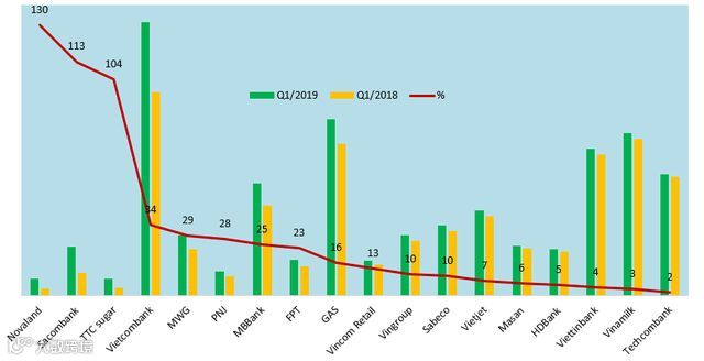 Novoland地产NVL增幅最大,房地产转让收入猛增助于公司净利润达2820亿盾,同比增长一倍。