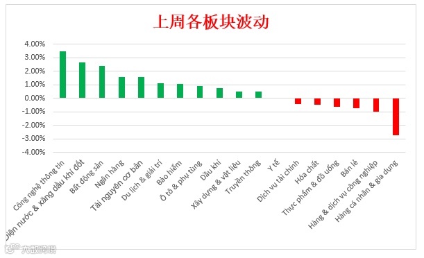 上周市场涨势蔓延到众多板块,特别是信息技术、电水石油天然气、房地产和银行等板块。