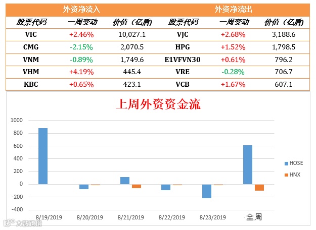 除了8月19日外资通过大宗交易购买800万VIC股票,相当于9360亿盾之外,上周外资继续净卖出。全周总结,外资投资者在胡志明和河内证交所分别净买入6090亿盾和960亿盾。
