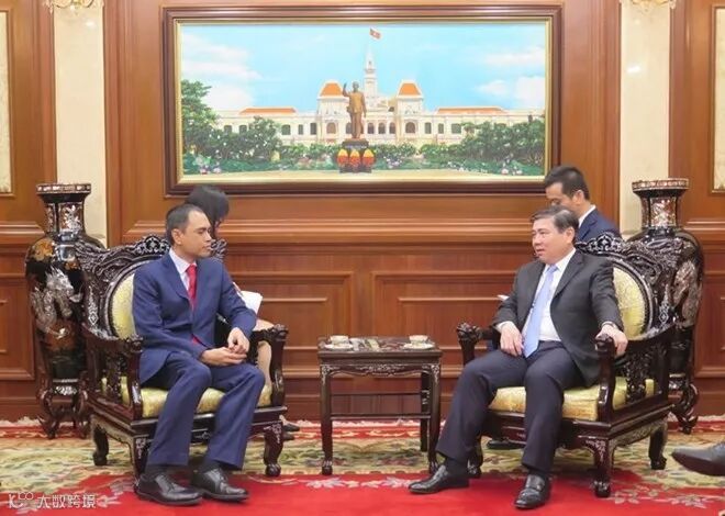 胡志明市人民委员会主席阮成峰(右)会见马来西亚驻越南特命全权大使扎姆鲁尼·哈立德。图自http://www.hochiminhcity.gov.vn