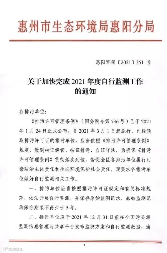 惠阳环函〔2021〕351号 关于加快完成2021年度自行监测工作的通知