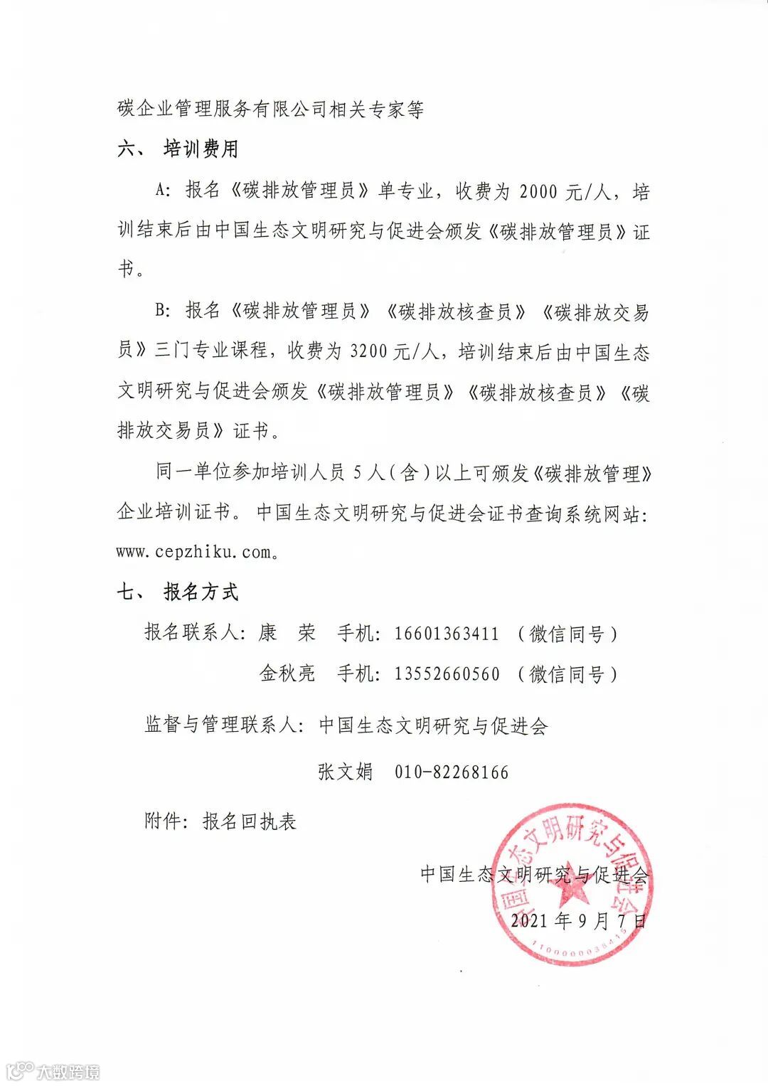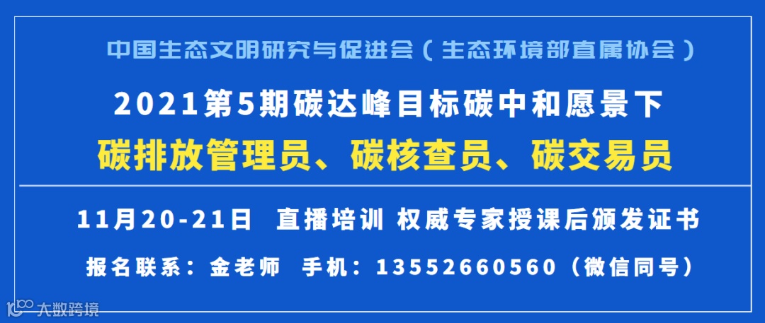 由生态环境部直属协会中国生态文明研究与促进会举办的“2021年碳达峰目标碳中和愿景下全国碳排放管理员、碳排放核查员、碳交易员培训班的通知(第5期)”。培训时间:2021年11月20-21日。此培训班针对碳排放项目特点,立足碳排放管理的需求,培养适合当下碳排放、管理的专业型人才。