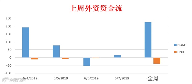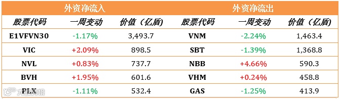 在胡志明交易所,外资交易相当积极,上周三个交易日净流入,总额为2250亿盾,主力流入E1VFVN30基金券和Vin 集团VIC。另外,在河内交易所,外资在5个交易日净流出,总额为390亿盾。