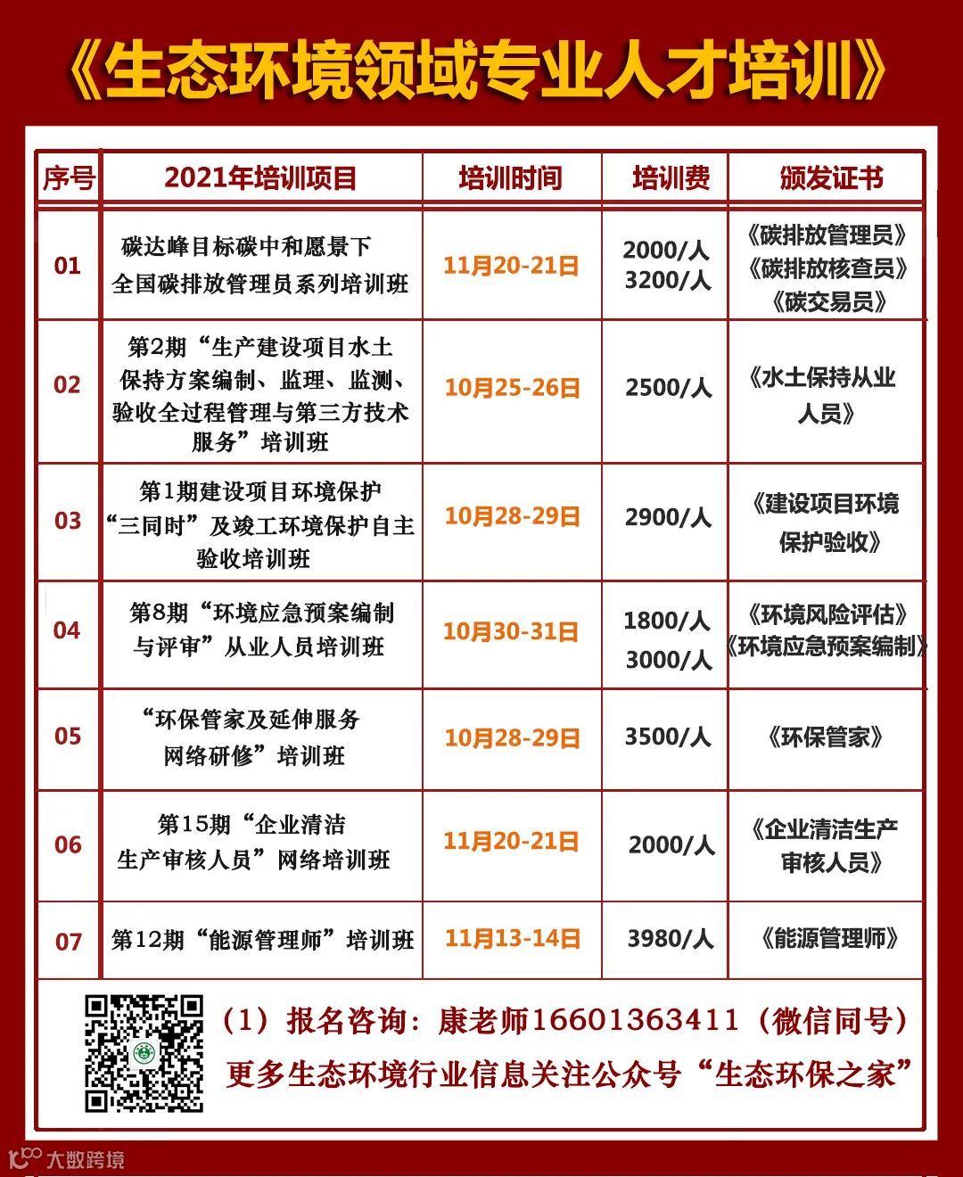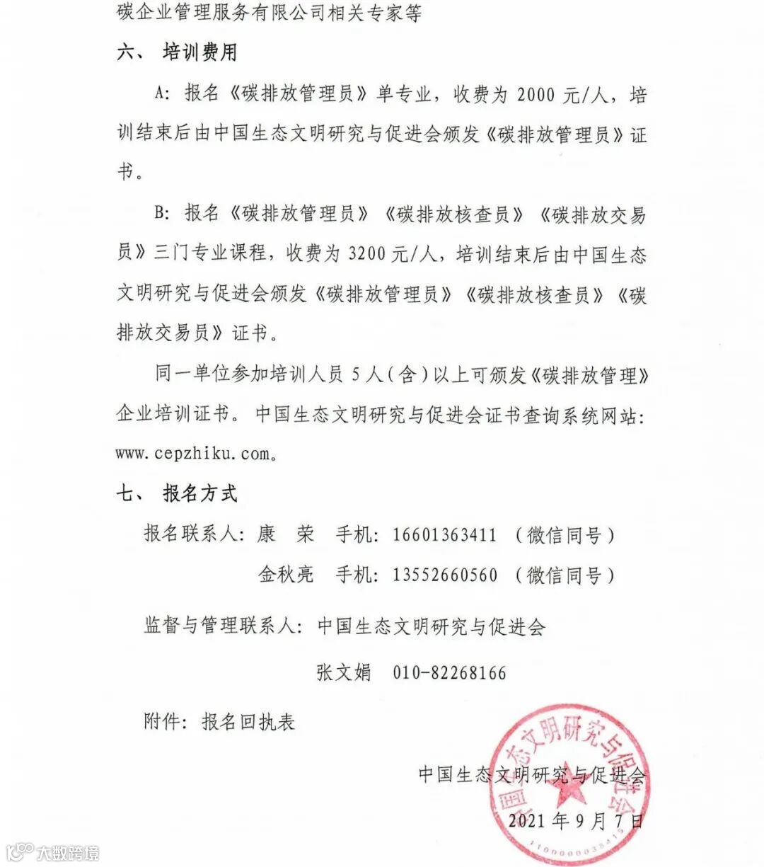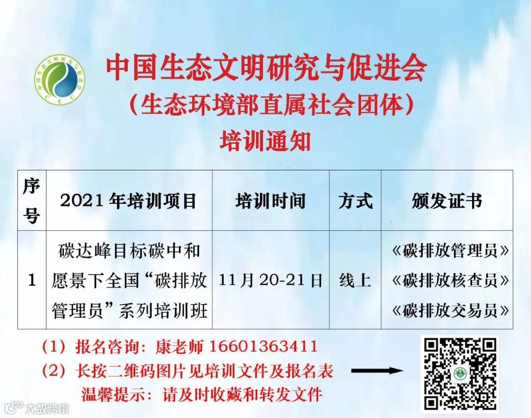 由生态环境部直属协会中国生态文明研究与促进会举办的“2021年碳达峰目标碳中和愿景下全国碳排放管理员、碳排放核查员、碳交易员培训班的通知(第5期)”。培训时间:2021年11月20-21日。此培训班针对碳排放项目特点,立足碳排放管理的需求,培养适合当下碳排放、管理的专业型人才。