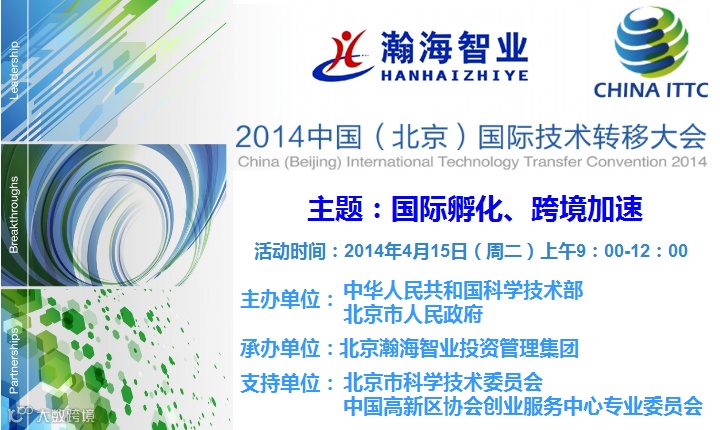 2014中国(北京)国际技术转移大会“国际孵化 跨境加速”专场于2014年4月15日(周二)上午9:00-12:00在中国北京国际会议中心一层5号会议室D区召开。国际高端盛会,聆听精英观点,开启创业梦想。瀚海智业邀您共享盛会!