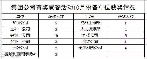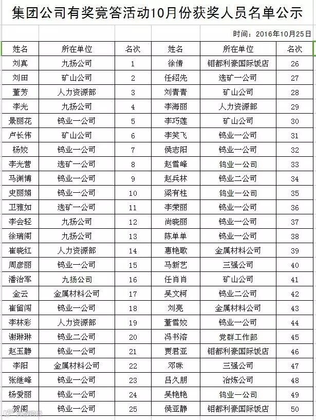 下面是10月份获奖人员名单,请各单位及时到集团公司党群工作部领取奖品。