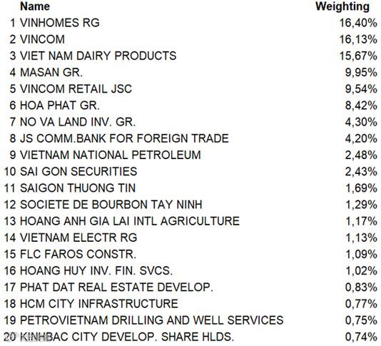 FTSE Vietnam ETF成分股名单中,Vinhomes地产VHM的比重最大(16.4%),其次是Vin 集团VIC(16.13%),越南牛奶VNM (15.67%),马山集团MSN(9.95%)等。