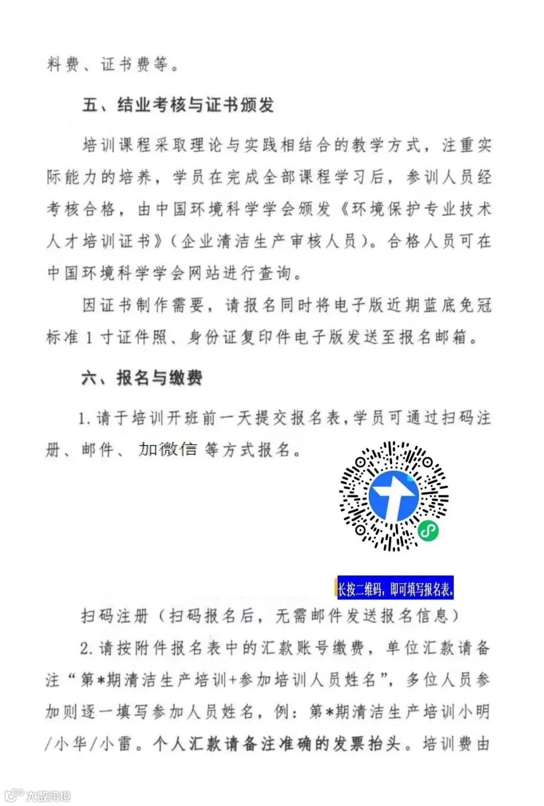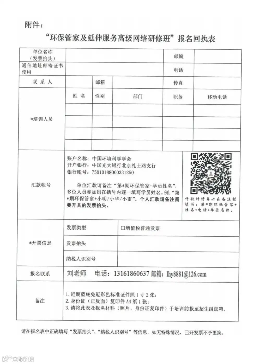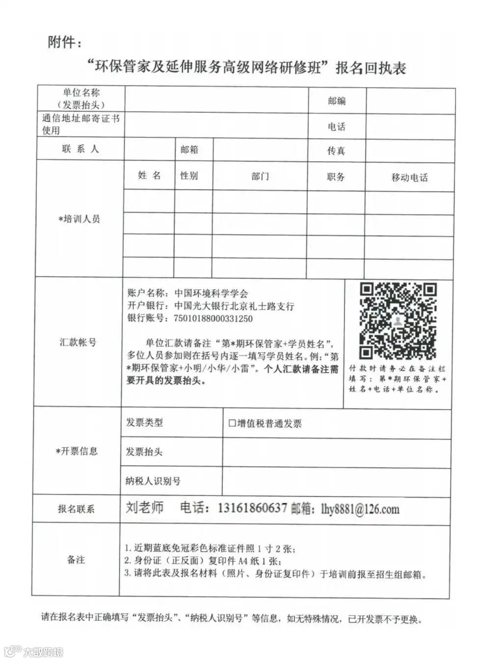 单位汇款请备注“第*期清洁生产+参训人员姓名”,多位人员参加则在括号内逐一填写参加人员姓名,例:第*期清洁生产小明/小华/小雷。个人汇款请备注准确的发票抬头。