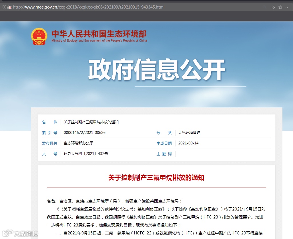 一、自2021年9月15日起,二氟一氯甲烷(HCFC-22)或氢氟碳化物(HFCs)生产过程中副产的HFC-23不得直接排放。