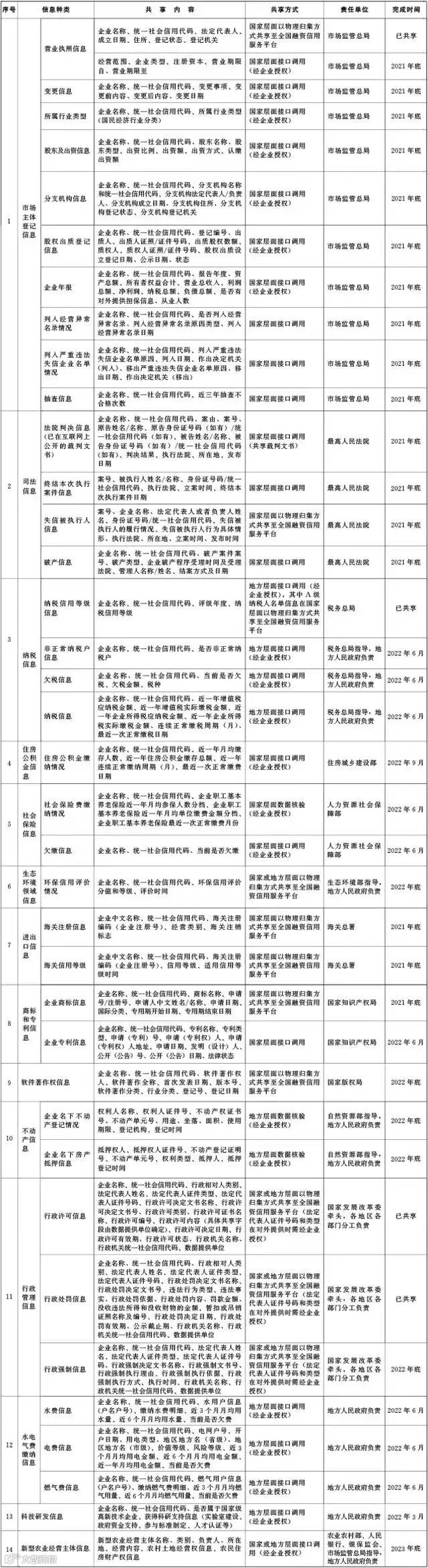 全国中小企业融资综合信用服务平台信用信息共享清单如下: