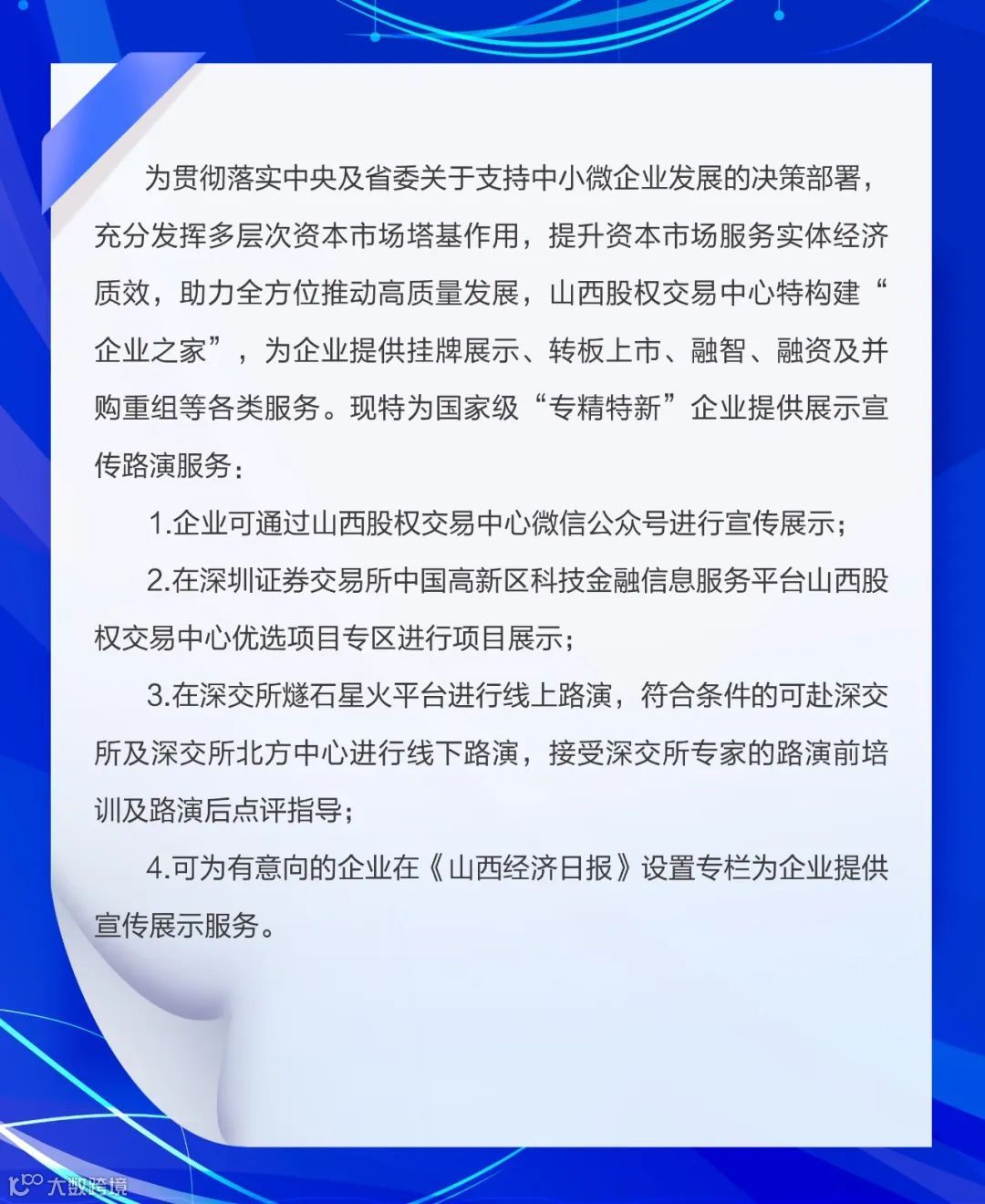 山西股权交易中心是经山西省人民政府批准设立的省内唯一的区域性股权市场运营主体,专注为省内中小微企业提供改制辅导、融资转让、财务顾问、信息咨询、管理培训、路演宣传、上市培育等全方位个性化金融服务,赋能地方实体经济和中小微企业高质量发展。