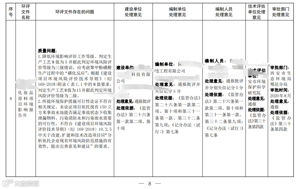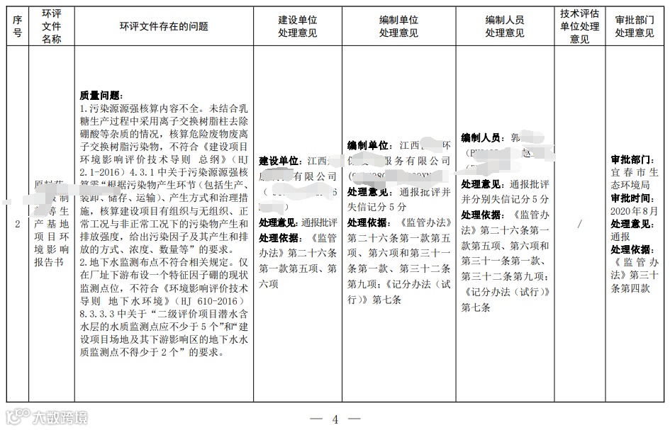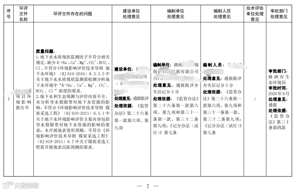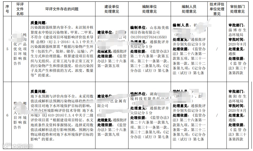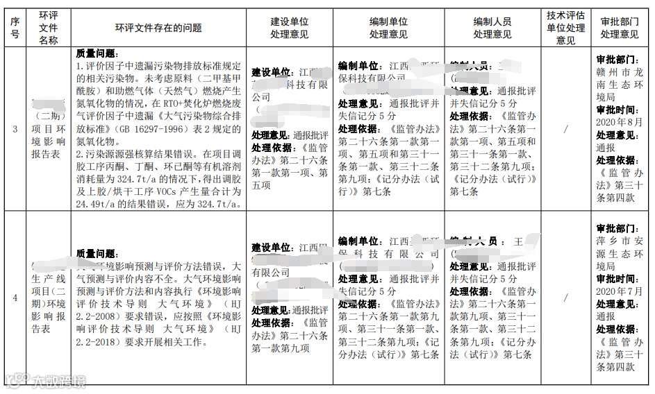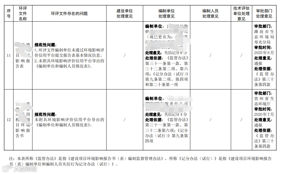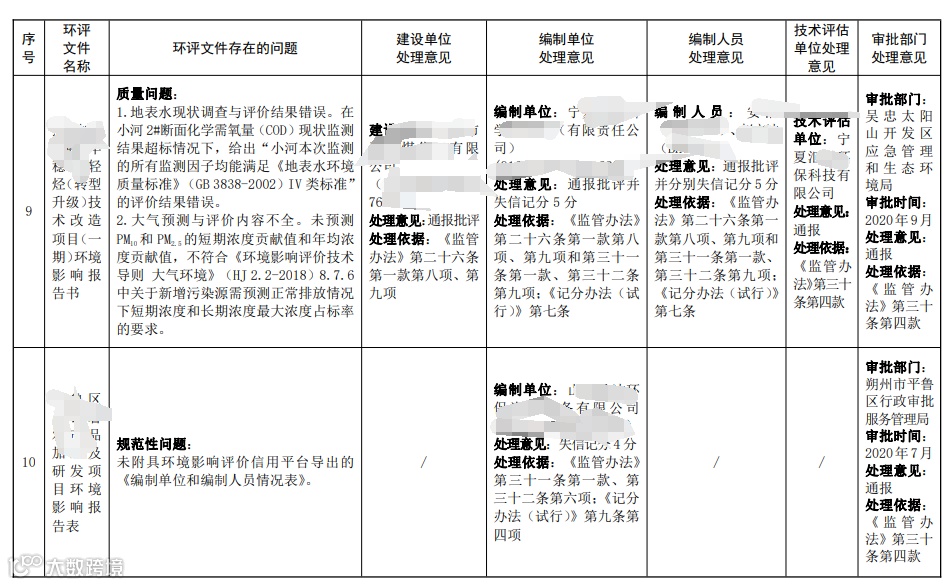 经复核发现,12份环评文件存在不同程度的问题,其中9份存在环境影响因素分析不全、污染源源强核算内容不全、监测布点不符合相关规定等质量问题,3份存在未按规定附具环评文件编制单位和编制人员情况表等规范性问题。根据《建设项目环境影响报告书(表)编制监督管理办法》《建设项目环境影响报告书(表)编制单位和编制人员失信行为记分办法(试行)》相关规定,对12份环评文件涉及的9家建设单位、8家编制单位和13名编制人员予以通报批评,对11家编制单位和13名编制人员予以失信记分,对2家技术评估单位和12个审批部门予以通报。具体问题及处理意见等情况详见附件。