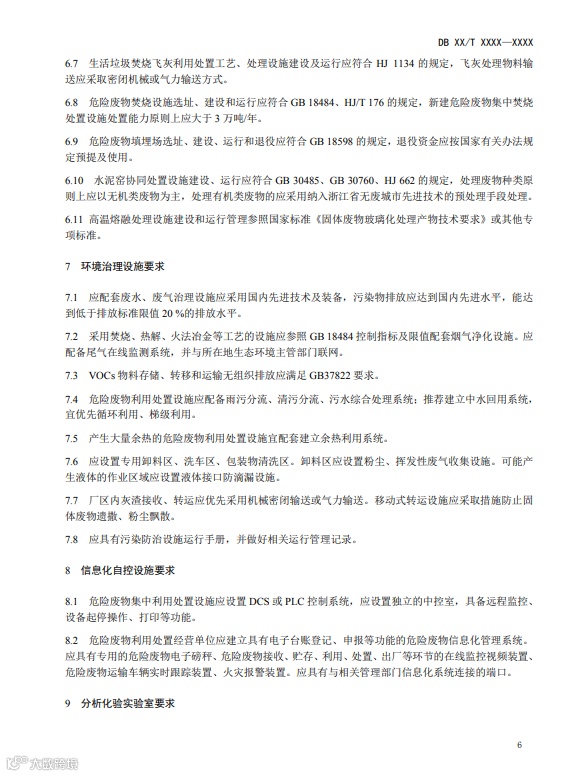 6.10水泥窑协同处置设施建设、运行应符合 GB 30485、GB 30760、HJ 662 的规定,处理废物种类原则上应以无机类废物为主,处理有机类废物的应采用纳入浙江省无废城市先进技术的预处理手段处理。