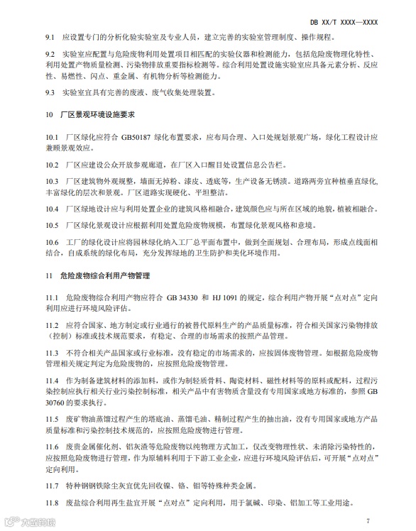 9.2实验室应配置与危险废物利用处置项目相匹配的实验仪器和检测能力,包括危险废物理化特性、利用处置产物质量检测、污染物排放重要指标检测等。综合利用处置设施实验室应具备元素分析、反应性、易燃性、闪点、重金属、有机物分析等检测能力。