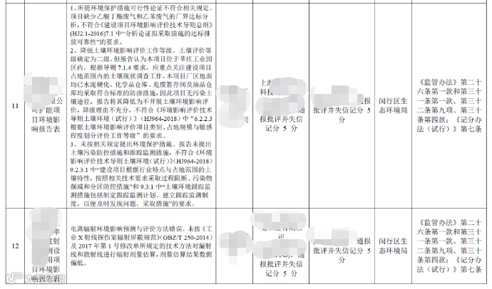 经复核,发现12份建设项目环境影响报告书(表)存在降低环境影响评价标准、现有项目回顾描述不全、污染源源强核算方法错误或核算内容不全、环境质量现状监测因子不符合相关规定、环境影响预测与评价方法错误或评价内容不全、所提环境保护措施可行性论证不符合相关规定等编制质量问题。根据《管理办法》第二十六条、第三十一条和第三十二条第九项以及《建设项目环境影响报告书(表)编制单位和编制人员失信行为计分办法(试行)》第七条规定,我局决定对11家环评文件编制单位、16名编制人员予以通报批评和失信记分,相关失信记分情况记入其诚信档案;对12家建设单位予以通报批评,对6个审批部门予以通报(具体情况详见附件)。