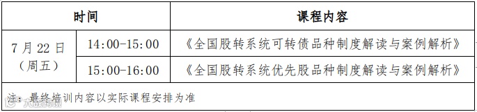 全国股转系统可转换公司债券制度发布实施后,新三板形成了以普通股、可转债、优先股为主的多元化融资品种架构。为推动市场主体提高对新三板融资品种认识,深入了解可转债、优先股等产品特点、适用场景、制度规则和监管要求,全国股转公司拟于7月22日在线举办全国股转系统创新融资品种业务专项培训活动。培训具体安排如下: