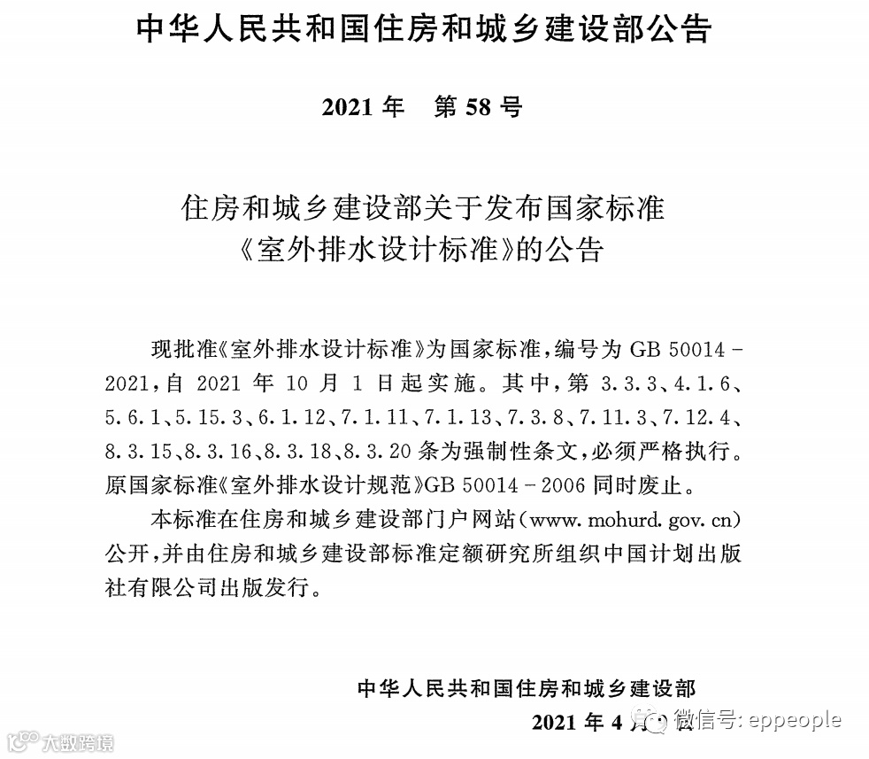 GB 50014-2021《室外排水设计标准》于2021年4月9日经住房和城乡建设部批准发布,自2021年10月1日起实施,原国家标准《室外排水设计规范》GB 50014-2006同时废止。本标准第3.3.3、4.1.6、5.6.1、5.15.3、6.1.12、7.1.11、7.1.13、7.3.8、7.11.3、7.12.4、8.3.15、8.3.16、8.3.18、8.3.20条为强制性条文,必须严格执行。