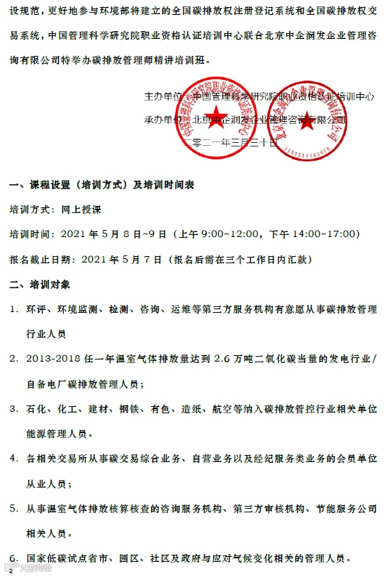为了在碳约束时代抢占市场先机,帮助温室气体排放单位和核查机构等掌握基本工作流程和正确的量化及核算方法,制定合理的监测计划,并熟知MRV体系建设规范,更好地参与环境部将建立的全国碳排放权注册登记系统和全国碳排放权交易系统,中国管理科学研究院职业资格认证培训中心联合北京中企润发企业管理咨询有限公司特举办碳排放管理师精讲培训班。