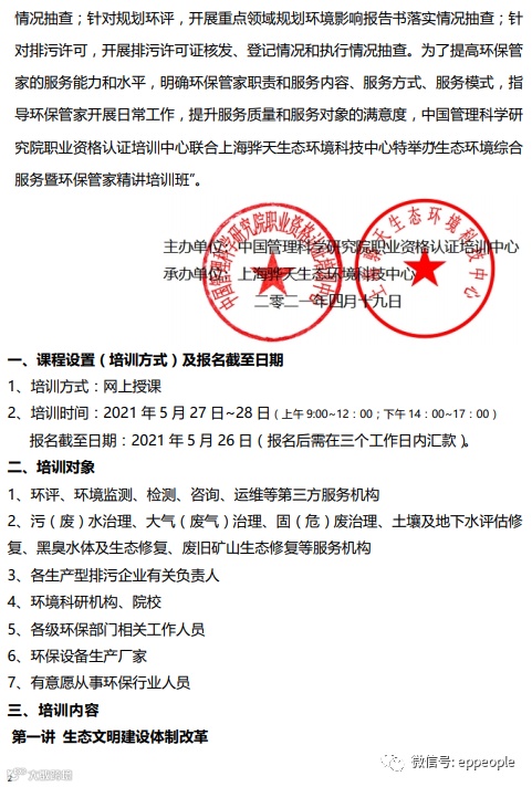 同时,为贯彻落实《国家中长期人才发展规划纲要(2010-2020)》的部署、以及人力资源和社会保障部发布的《关于印发专业技术人才知识更新工程实施方案的通知》的要求,做好专业技术人才知识更新培训,提高环保人员的专业能力和职业素养,中国管理科学研究院职业资格认证培训中心举办生态环境管理技能人才系列培训,颁发专业能力证书,支持环保人实现技能提升。培训项目如下: