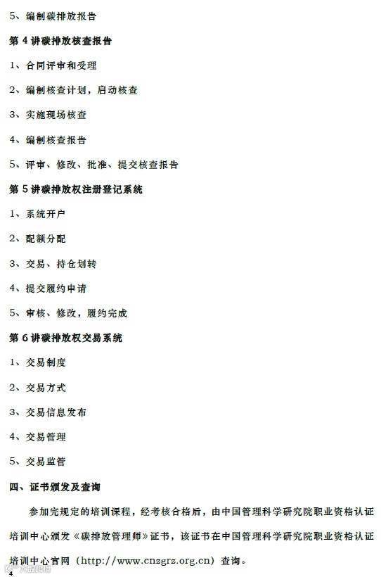 参加完规定的培训课程,经考核合格后,由中国管理科学研究院职业资格认证培训中心颁发《碳排放管理师》证书,该证书在中国管理科学研究院职业资格认证培训中心官网(http://www.cnzgrz.org.cn)查询。