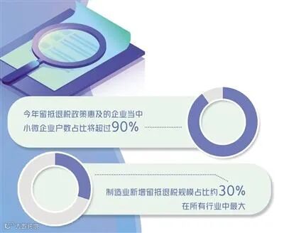 在政策覆盖范围上,既全面覆盖小微企业,又重点突出六大行业。今年留抵退税政策惠及的企业当中,小微企业户数占比将超过90%;制造业新增留抵退税规模占比约30%,在所有行业中最大。通过聚焦国民经济运行和产业链、供应链中的重点及关键环节,精准释放退税红利和改革效应。