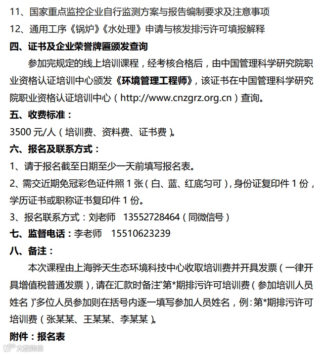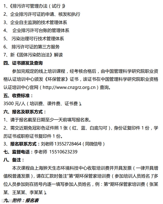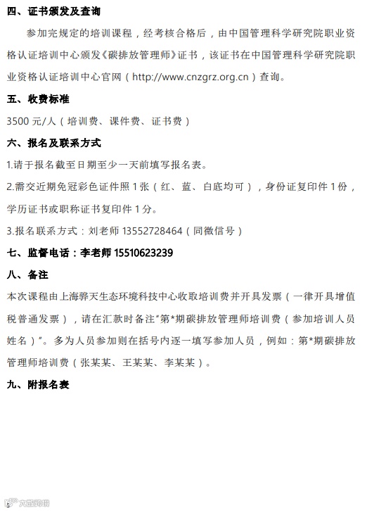 六、备注:本次课程由上海骅天生态环境科技中心收取培训费并开具发票(一律开具增值税普通发票),请在汇款时备注“第*期**培训费(参加培训人员姓名)”多位人员参加则在括号内逐一填写参加人员姓名,例:第*期**培训费(张某某、王某某、李某某)。