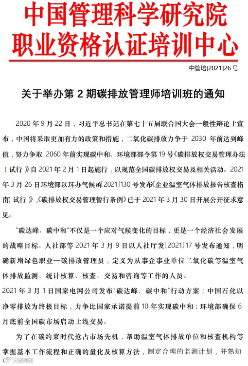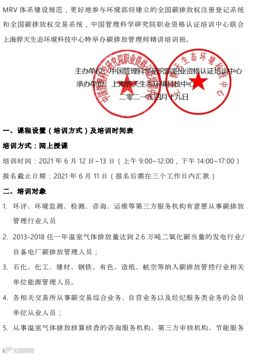 为了在碳约束时代抢占市场先机,帮助温室气体排放单位和核查机构等掌握基本工作流程和正确的量化及核算方法,制定合理的监测计划,并熟知MRV体系建设规范,更好地参与环境部将建立的全国碳排放权注册登记系统和全国碳排放权交易系统,中国管理科学研究院职业资格认证培训中心联合北京中企润发企业管理咨询有限公司特举办碳排放管理师精讲培训班。