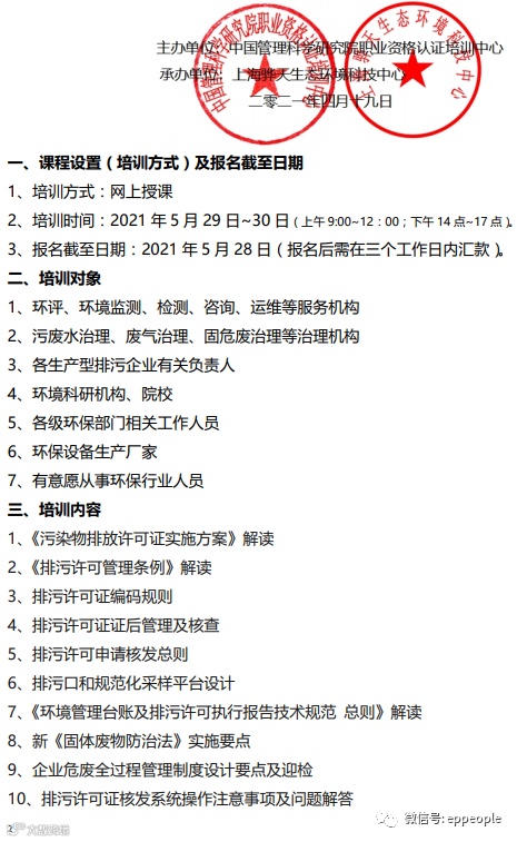 红头文件3:关于排污许可”一证式“管理专业化人才培训暨环境管理工程师培训班的通知