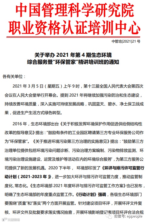 同时,为贯彻落实《国家中长期人才发展规划纲要(2010-2020)》的部署、以及人力资源和社会保障部发布的《关于印发专业技术人才知识更新工程实施方案的通知》的要求,做好专业技术人才知识更新培训,提高环保人员的专业能力和职业素养,中国管理科学研究院职业资格认证培训中心举办生态环境管理技能人才系列培训,颁发专业能力证书,支持环保人实现技能提升。培训项目如下: