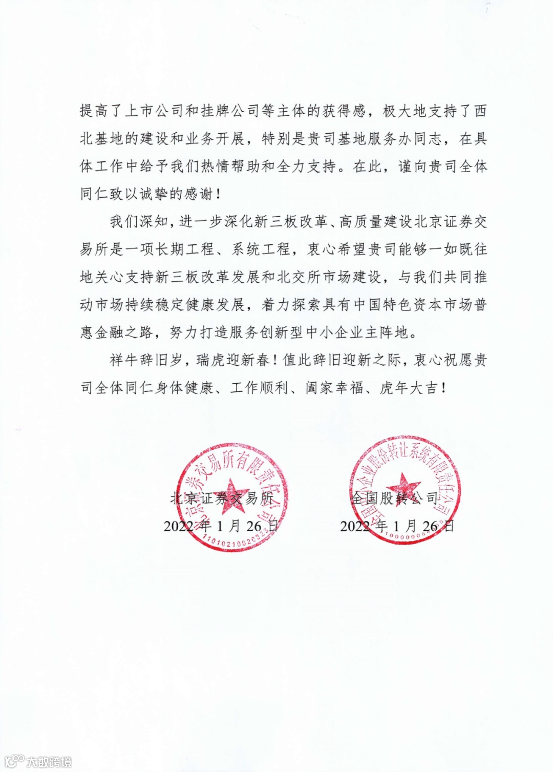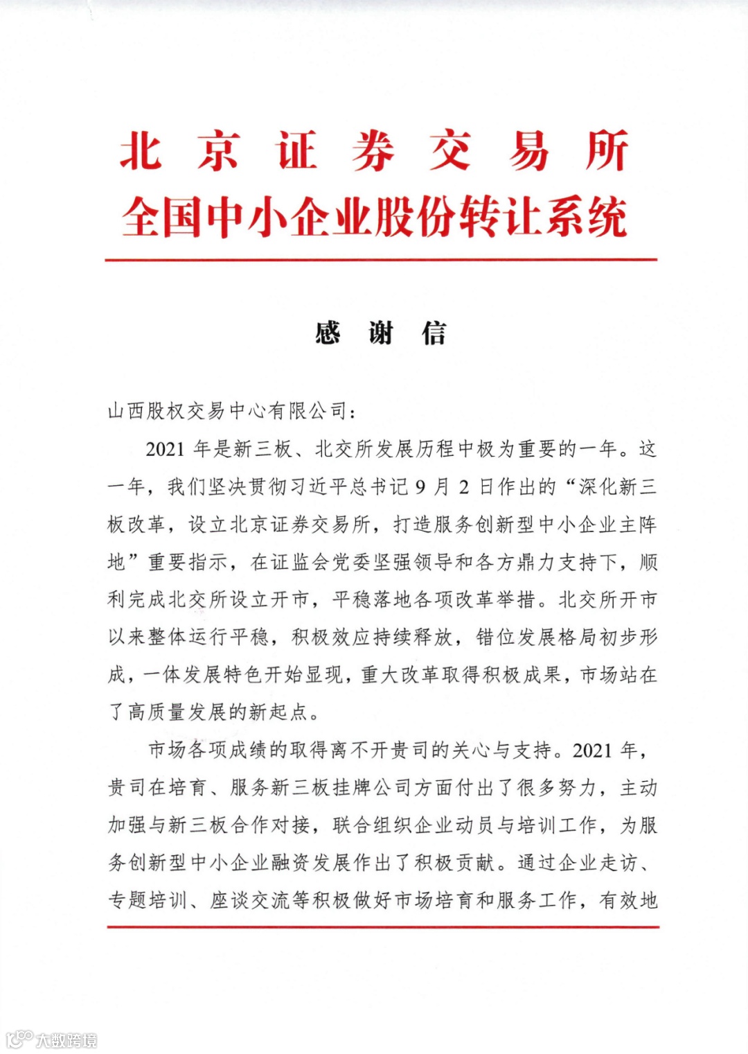 导读:1月27日,北京证券交易所、全国股转公司向山西股权交易中心有限公司发来感谢信,对公司在培育、服务新三板挂牌公