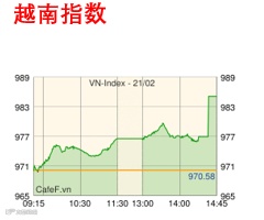 2月21日越南股市开盘交易积极,从头到尾一直保持涨势。收盘集合竞价ATC时间资金流强劲涌入Vinhomes地产VHM,Vin集团VIC,Vincom零售VRE,马山集团MSN,越南牛奶VNM,西贡啤酒SAB等大盘股使得市场突然大幅上涨,其中,Vinhomes地产VHM甚至涨停。