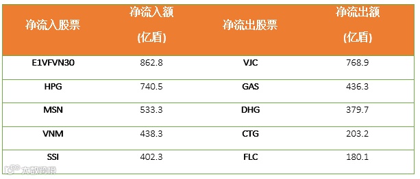 在胡志明证交所HOSE外资净流入2,583.3亿盾,河内证交所HNX外资净流入233.5亿盾。