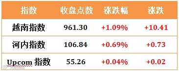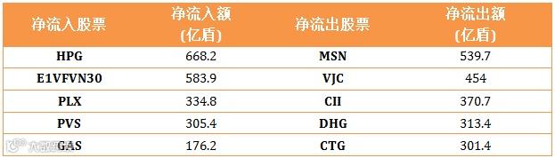 在胡志明证交所HOSE外资净流出120亿盾,河内证交所HNX外资净流入100.7亿盾。